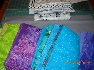 I finally picked some colors for the Bonnie Hunter mystery. I am still waiting for a purple and a limey green to get here but this will be some of the ones that I will use. I decided to go with the colors that Bonnie suggested since I really like them individually, I would not have normally picked them out to do a quilt. So this will be a new lesson for me and I can't wait to see how it tuns out.